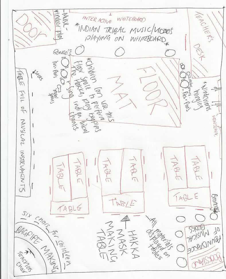 The environment was designed and constructed with deep consideration for the learing experiences intended for the children. When an early childhood environment is formed for social experiences, it begins to play a very crucial role in children's learning and development (Bullard, 2010). Therefore, the musical environment was desgined as a group environment, where the children are able to freely rotate around the classroom, experiencing multiple activities. The environment displays multiple tools and materials that correlate to the three continents that are dedicated to music; Europe with Ireland, Asia with India and Oceania with New Zealand. The room will contain an abundance of musical instruments native to the countries of Ireland, Mexico and New Zealand, as well as a range whimsical instruments such as wind chimes hanging by the windows. The instruments available to the children (which are a mixture of home-made, authentic and unconventional instruments), include a variety of percussion, wind and string instruments that allows them to explore musical elements such as dynamics, structure, pitch and timbre.